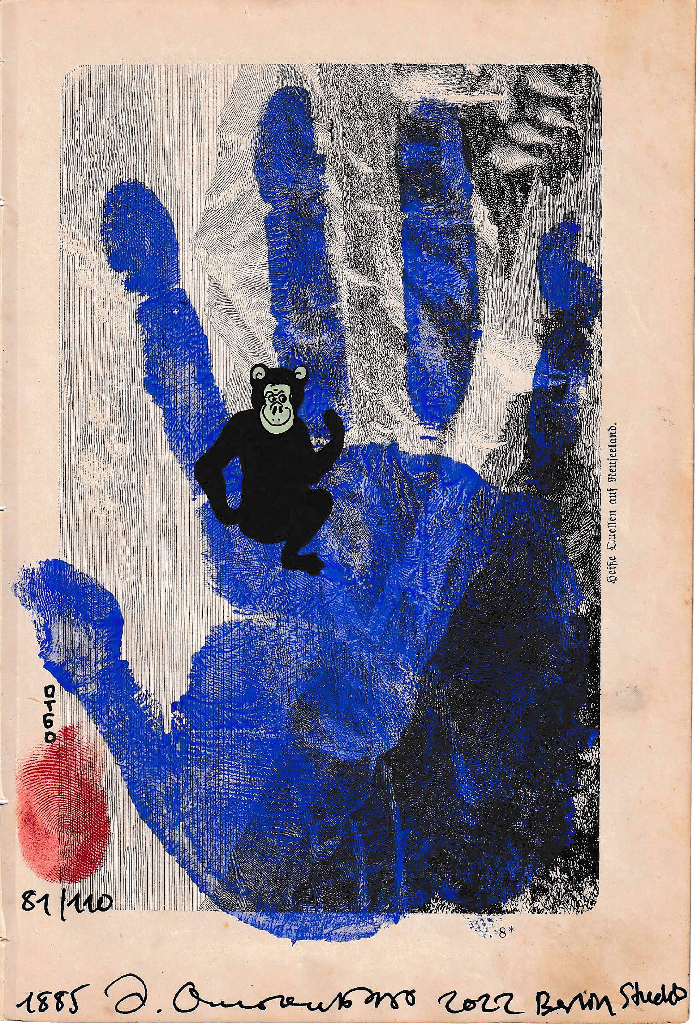 1885 OtGO Monkey 2022 Berlin Studio 081/110 by OtGO 2022, mixed media on 140 years old paper ca. 21 x 14 cm ('1885 OtGO Monkey 2022' consists of 110 equal-sized single paintings, each measuring ca. 21 by 14 cm)