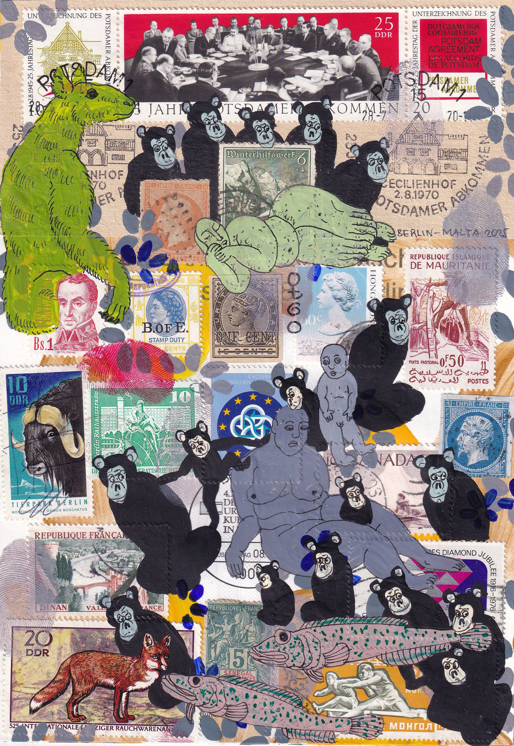 of Curiosities Malta-2 7 by OtGO 2025, ink and acryl on original Stamps, 210 x
